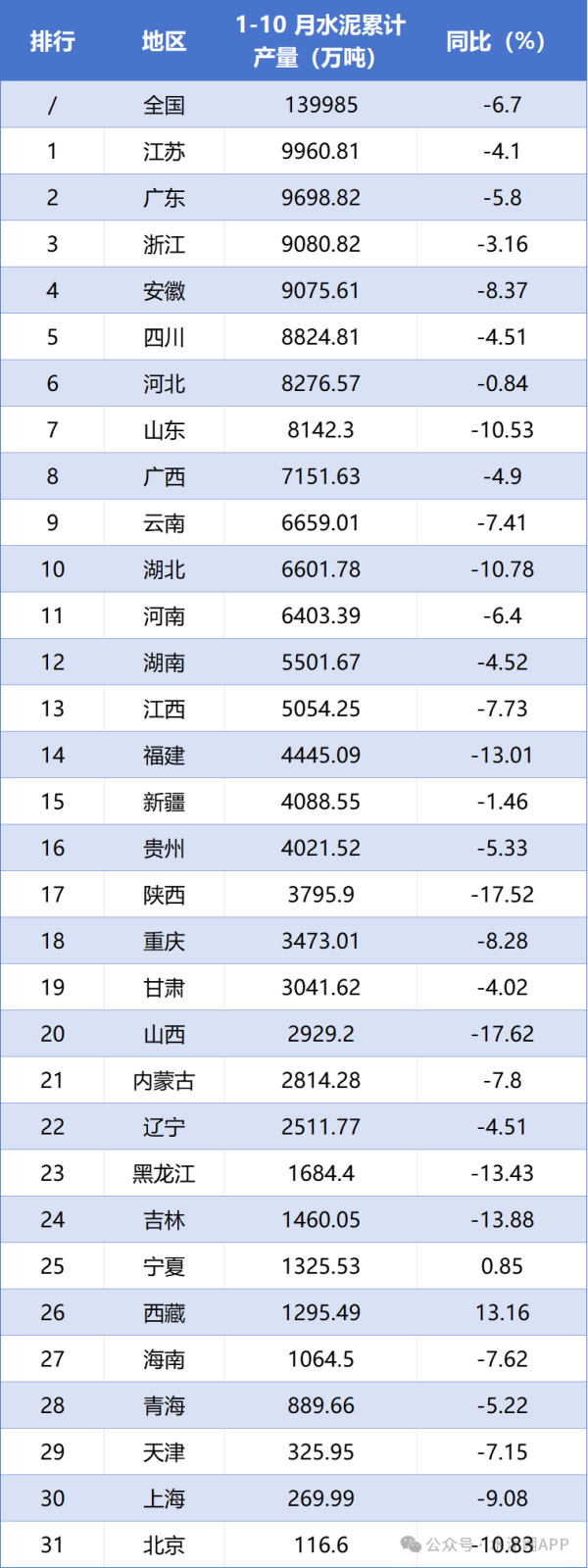 1-10月各地區水泥產量排名!